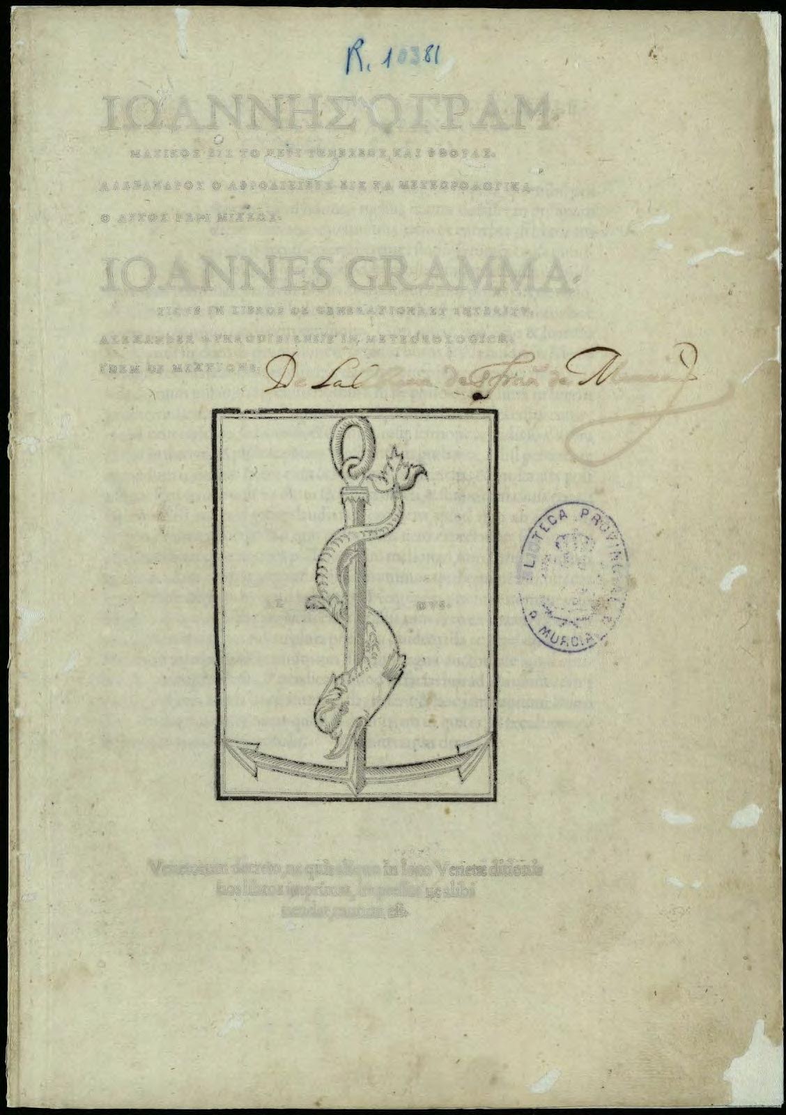 “Ioannes Grammaticus In libros de generatione et interitu Alexander Aphrodisiensis in meteorologica ; Idem de mixtione”, vuelve a brillar como hace 489 años, cuando se imprimió en la imprenta veneciana regida por los herederos de Aldo Manuzio.