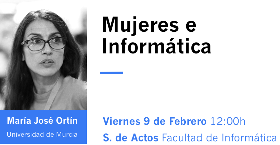 El viernes 9 de febrero, a las 12:00, en el salón de actos de la Facultad de Informática, María José Ortín nos hablará sobre el papel que la mujer ha tenido, tiene y tendrá en la Informática.